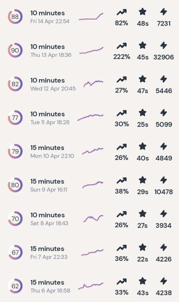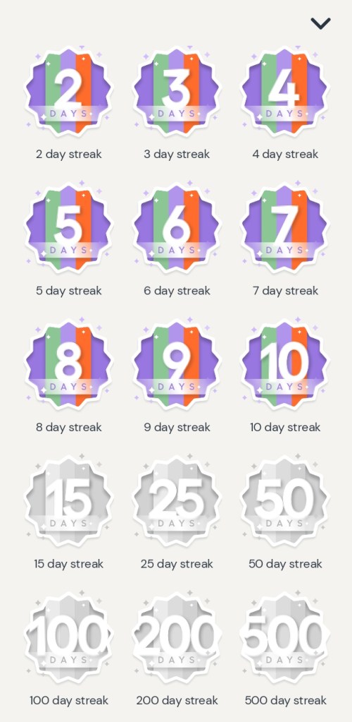 I started training with a base level score of 62 and currently have an overall wellness score of 89. The score is actually higher if you enter daily notes into the app after each session. The overall score is determined by both performance and consistency. I’ve taken a lot of notes, but none into the Mendi app. Mendi’s achievement system is a nice touch. Here is an example of tracked achievements: