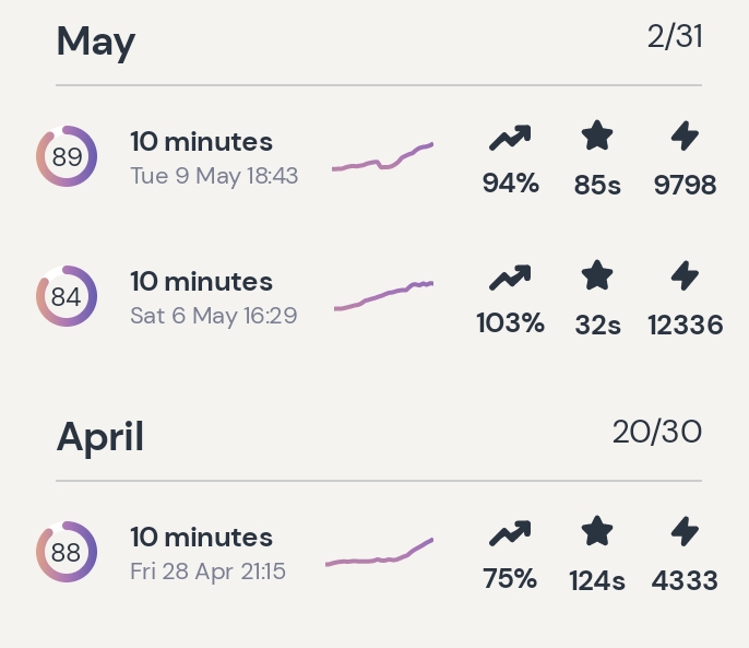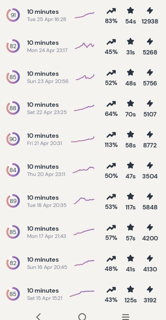 I think Day 20 (April 25th) was the last Neurofeedback session score reported. I could easily check that but I’m going to forge on here to Tuesday, May 9th, Day 22..
