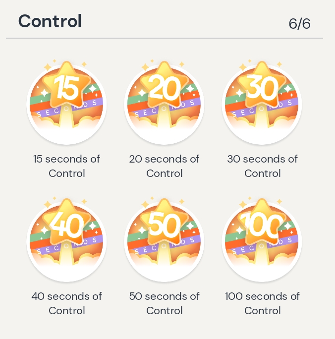 There is no control award above 100 seconds of control. Longest daily streak (without a break): 10 Days.